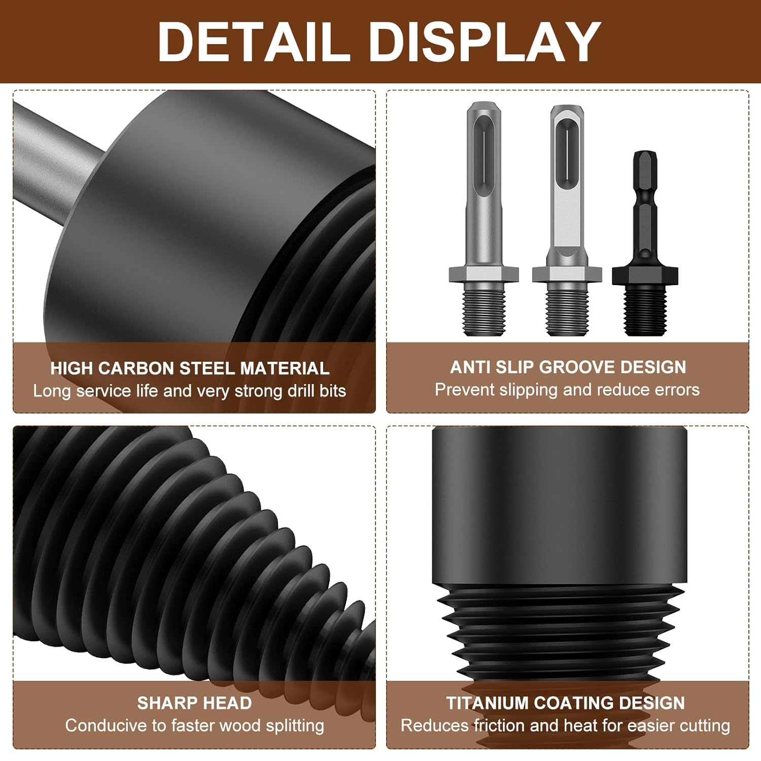 Deze houtblokboor is een zeer efficiënt houtblokgereedschap en houtopeningsgereedschap, dat snel houtblokken kan splijten en de productiviteit kan verhogen. Titaniumcoating kan wrijving en hitte verminderen door warmtebehandeling, gemakkelijk te snijden.