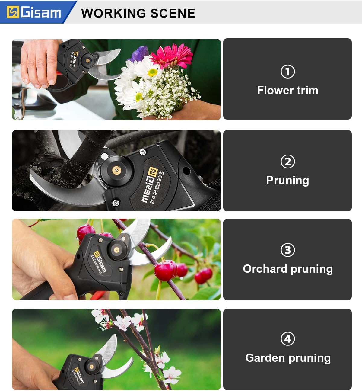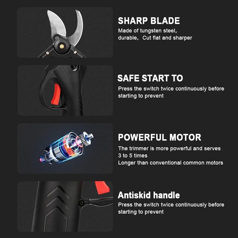 Onze professionele elektrische snoerloze snoeischaar die is gesmeed uit SK5 koolstofstaal, zeer scherp en duurzaam. Het kan gemakkelijk harde takken van max. 30 mm harde takken knippen, snel gesneden, schoon en vlak, beschadigt de takken niet, gezond voor de boom.